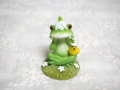 カエルが膝に鳥を乗せて、花の帽子を被っています♪